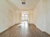 De gemeenschappelijke entree biedt toegang tot het appartement op de eerste verdieping via de trap. De woonkamer, die zich uitstrekt van voor naar achter, kenmerkt zich door hoge plafonds en de extra ruimte in de serre. Aan de voorzijde van deze woonkamer bevindt zich een zeer ruime open keuken die kan worden afgesloten met schuifdeuren. Deze keuken is uitgerust met een 4-pits gaskookplaat en een vaatwasser.