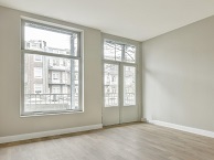 De woonkamer aan de voorzijde heeft drie grote ramen en biedt een prachtig vrij uitzicht over het Bellamyplein met zijn eeuwenoude boom en zwemfontein. De plafondhoogte van 2,75 meter geeft het appartement een extra ruimtelijk gevoel.