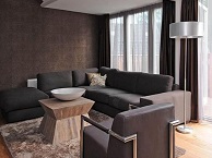 Sfeervol ingerichte zitkamer met openslaande deuren over de volle breedte naar riant dakterras.