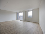 We startten in de woonkamer. Dit is een fijne ruimte door de open verbinding met de keuken. Door de grote raampartijen geniet je hier van veel lichtinval en met een loopdeur stap je gemakkelijk op het balkon. Vanuit deze ruimte ga je naar de separate toiletruimte (met zwevend toilet en fontein), de slaapkamer en de badkamer.