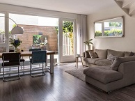 Lichte hal met meterkast, toiletruimte en trapkast. Tuingerichte woonkamer met een laminaatvloer, raampartijen tot aan de grond en met toegang tot de besloten en zeer zonnig gelegen achtertuin.