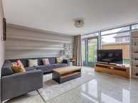 De royale woonkamer is smaakvol ingericht en beschikt over een airco. Daarnaast is er een overvloed aan natuurlijk licht dankzij de grote raampartijen. Via de dubbele deuren wordt de riante, zonnige tuin van ca 40 m2, gelegen op het zuidwesten, betreden. De tuin beschikt over een ruime schuur en een achterom.
