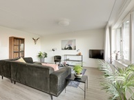 De ruime en brede woonkamer is het middelpunt van het appartement met een comfortabele grote bank, stoelen, dressoirkasten en een royale tv. Het appartement ademt vooral de ruimte in met zijn vrijstaande eethoek met 6 persoons eettafel, perfect als u thuis moet werken.