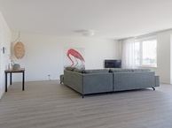 De ruime en brede woonkamer is het middelpunt van het appartement met een comfortabele grote bank, stoelen, dressoirkasten en een royale tv. Het appartement ademt vooral de ruimte in met zijn vrijstaande eethoek met 6 persoons eettafel, perfect als u thuis moet werken.