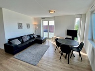 Ruime hal met toilet en intercom. Berging met wasmachine en droger. Badkamer met douche en wastafel. 2 ruime slaapkamers (15 en 10 m²) met Frans balkon. Ruime en lichte woonkamer met balkon. Keukenblok met gasfornuis, vaatwasser, oven, magnetron, koelkast en vriezer.