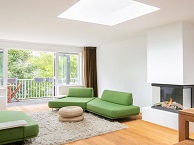 De grote woonkamer bevindt zich aan de achterzijde van het gebouw en heeft twee deuren die uitkomen op het ruime balkon (op het westen). De woonkamer is voorzien van een gashaard en twee grote dakramen die veel natuurlijk licht binnenlaten.