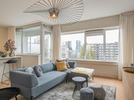 De ruime woonkamer met open keuken heeft een oppervlakte van ruim 38m2. De woonkamer is voorzien van fraaie armaturen en semi transparante gordijnen. Hierdoor heeft u een weids uitzicht over het centrum van Rotterdam. Tevens heeft u vanuit de woonkamer toegang tot het balkon van ruim 7m2.